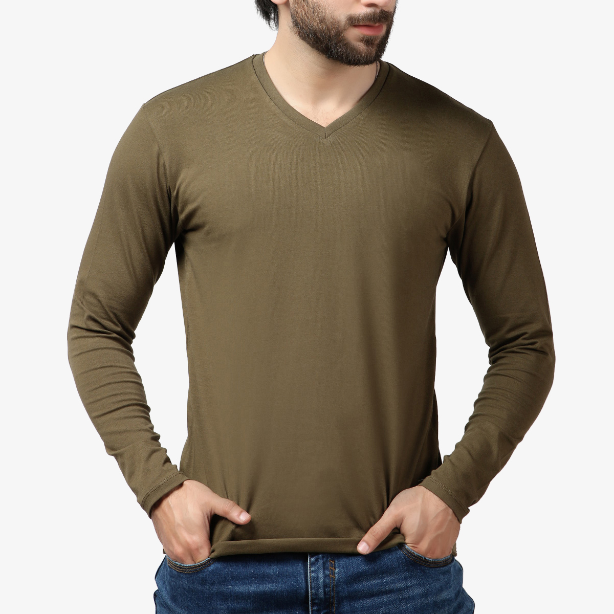 Crew neck full sleeve tee in Army Green collar and self fabric sleeve hem.